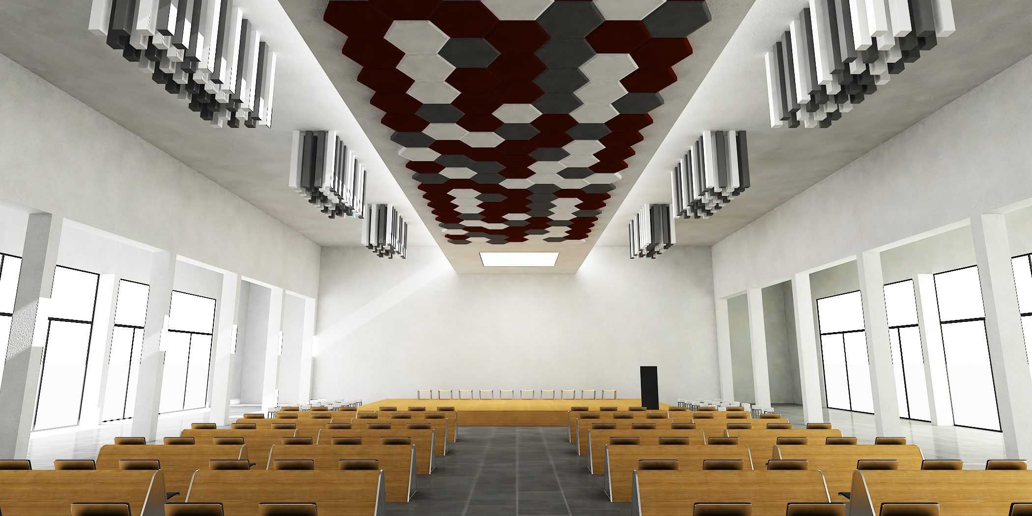 Esbozo digital de proyecto innovador para sala de conferencia donde los sistemas electroacústicas de sonido realizan la carga de comunicación necesitando un espacio ‘seco’ que facilite el entendimiento de la palabra y elimine reflexiones lejanas y tiempo excesivo de reverberación. Propuesta de elevada carga de diseño que juega con varias formas geométricas dentro de un mis espacio.
